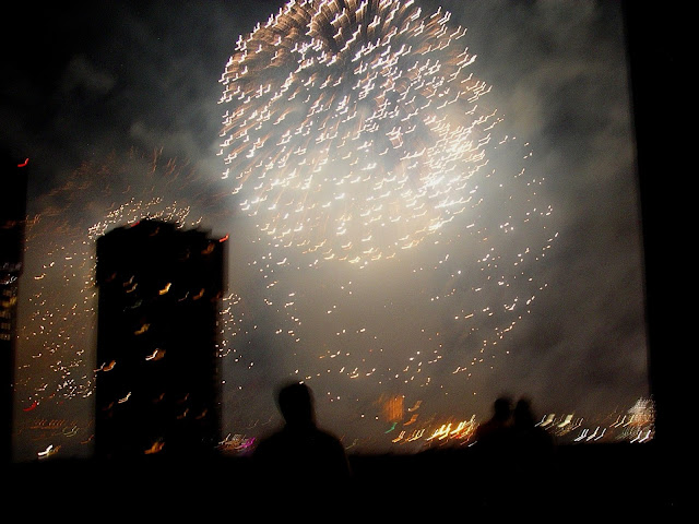 I stood in one spot on the roof and the force of the explosions seemed to vibrate the air. Though I was braced and steady, each photograph shadowed itself. I also think I was set at too slow a speed to freeze the images,
